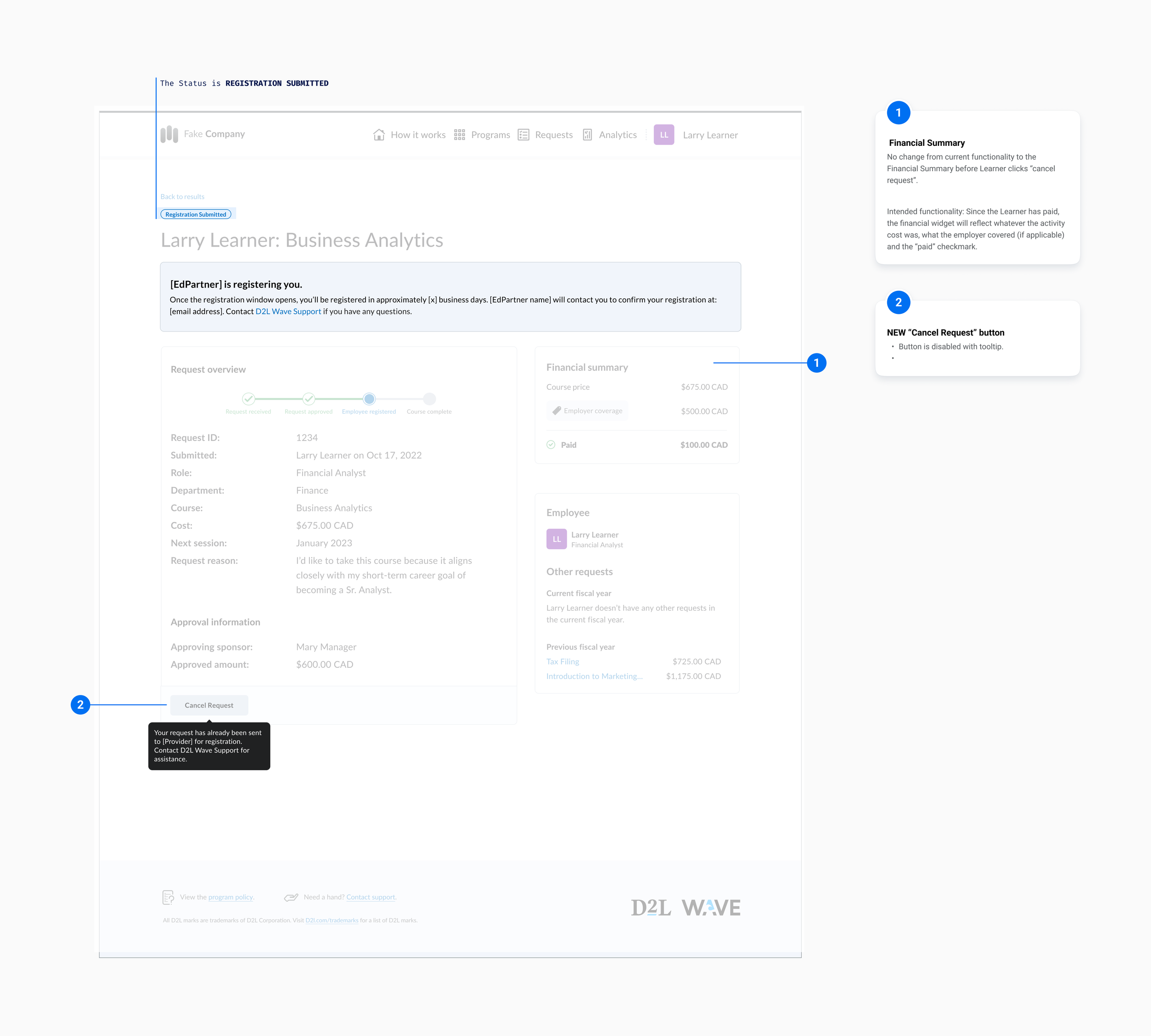 Guided support – When a request was in “Paid,” “Registration Sent,” or “Enrolled,” the Cancel button was disabled, and a tooltip directed Learners to reach out to support, aligning with Education Partner policies.